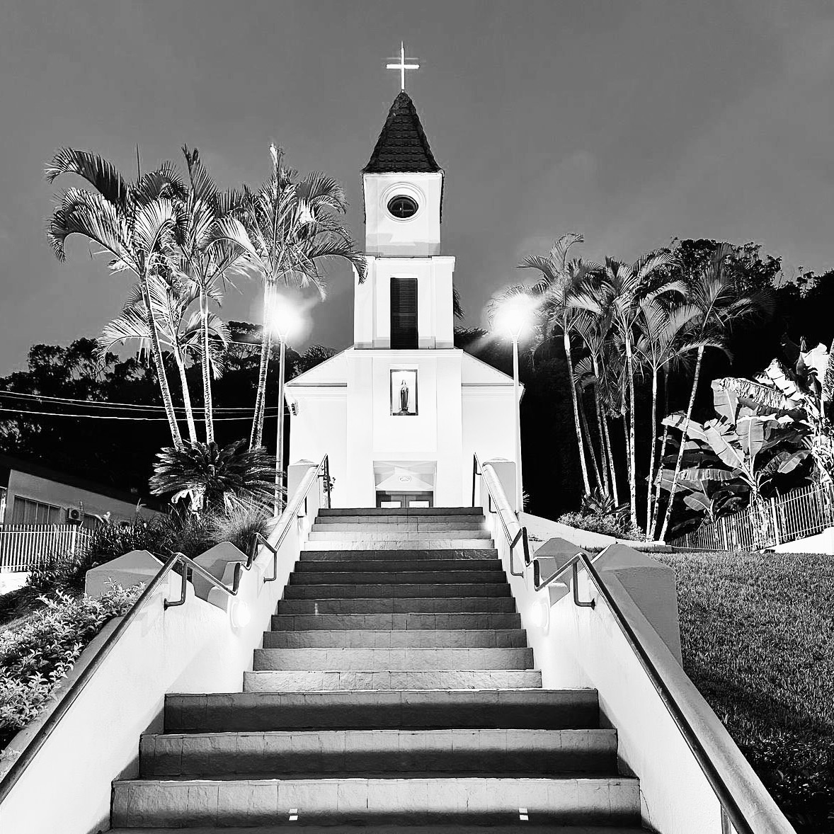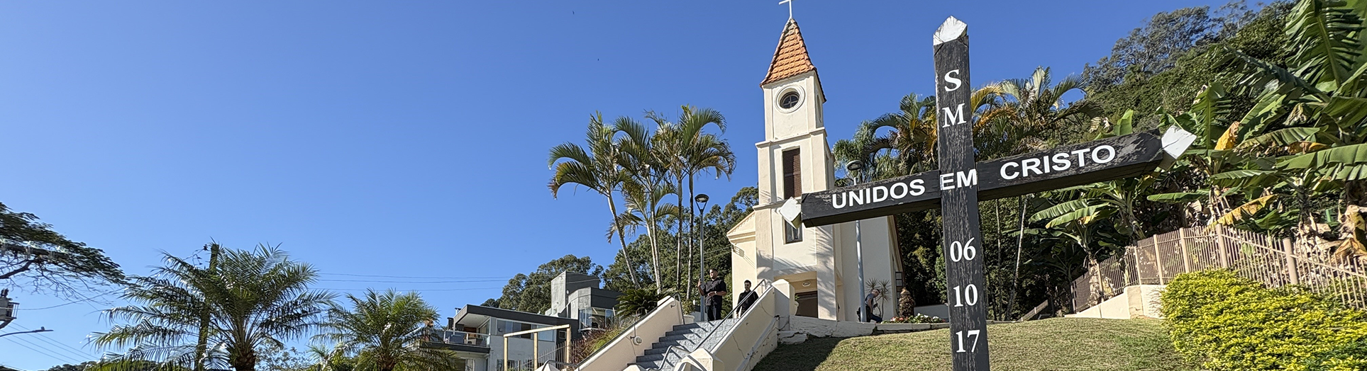 Em meio a mata, do alto de sua escadaria tem-se uma visão panorâmica da Praia de Cabeçudas.