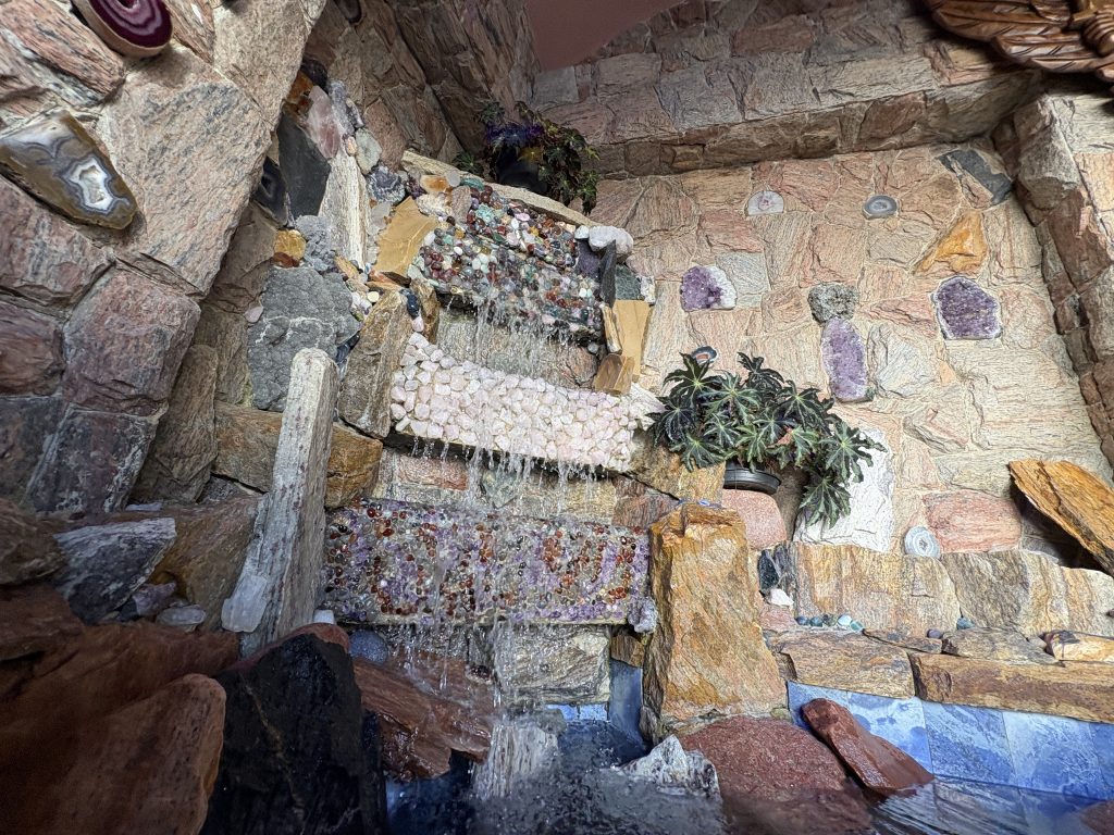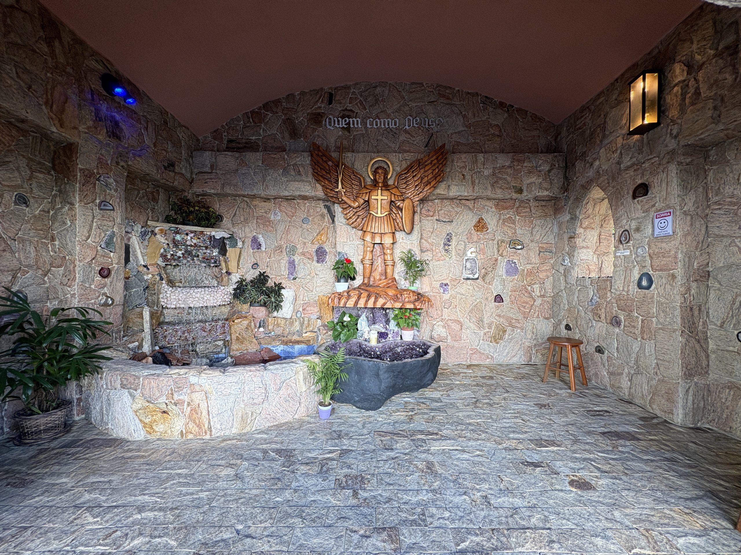 A imagem do arcanjo, esculpida em madeira itaúba pela artista plástica Suzi Thaler, de Treze Tílias, tem aos pés uma fonte com uma pedra ametista em formato de coração, pesando cerca de meia tonelada.